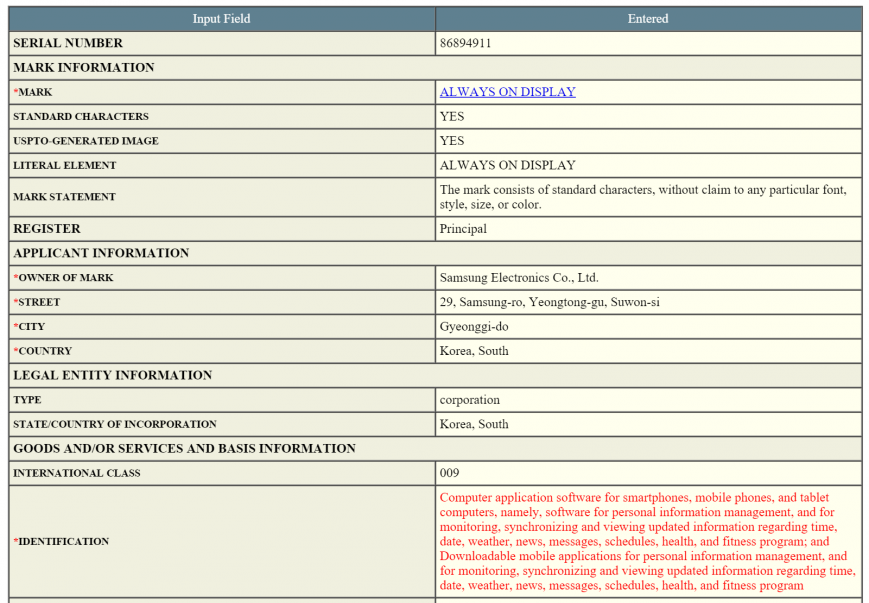 Також у мережі з’явилася чергова порція інформації про фішки майбутніх смартфонів Samsung Galaxy S7 та Galaxy S7 edge. На цей раз було знайдено заяву на торговельну марку “Always On Display”, яку виробник подав на реєстрацію. Як очікується, режим “Always On Display” передбачає постійне відображення найважливішої інформації, такої як годинник та оповіщення на невеликій ділянці дисплея. Для дисплея, виготовленого за технологією Super AMOLED це не повинно привести до сильного зниження часу автономної роботи. Відзначимо, що схожа функція вже використовувалася в смартфонах Nokia (під назвою Glance Screen) та Motorola (під назвою Ambient Display).