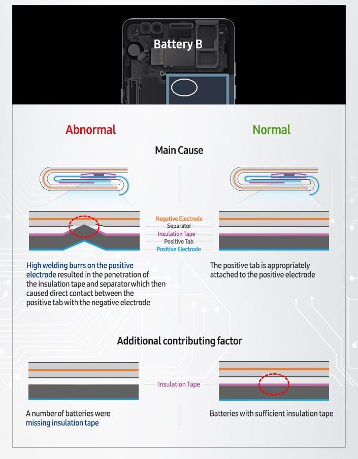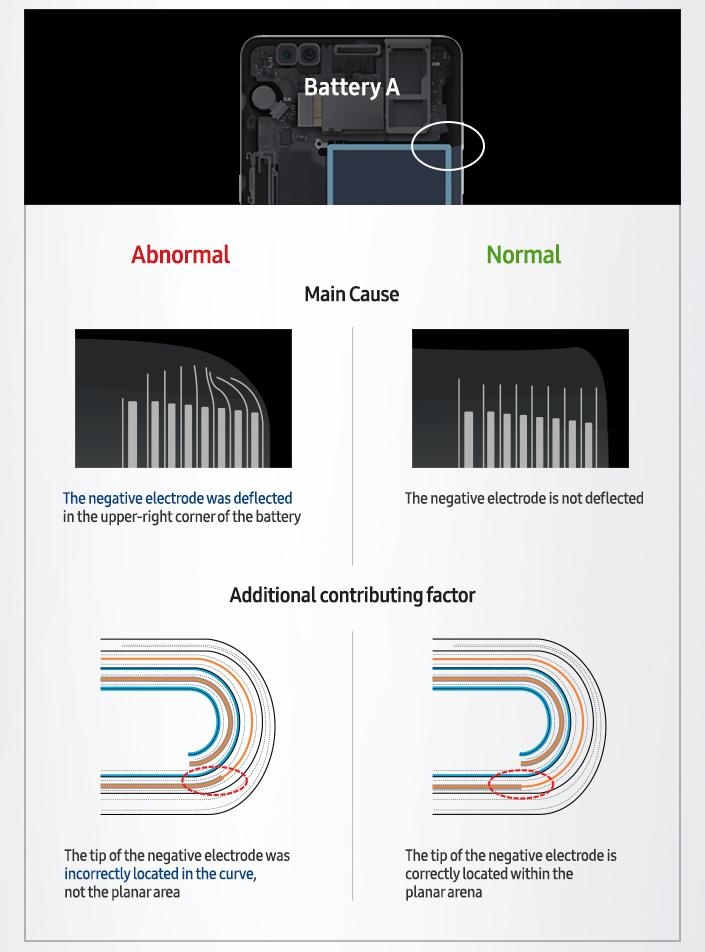 Батареї для Note7 поставляли Samsung SDI (Виробник A) і компанія, що базується в Гонконгу, Amperex Technology (Виробник B). Як було виявлено в результаті розслідування, самозаймалися як батареї виробника A, так і B. Зокрема, перегрів батарей компанії Samsung SDI був викликаний деформацією верхніх кутів, через що електроди гнулися і розташовувалися занадто близько один до одного, а також занадто тонкими перегородоками між електродами, що в результаті призводило до короткого замикання.