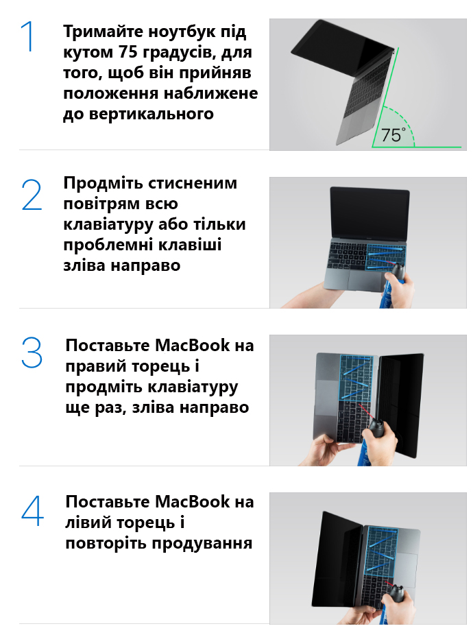 Єдино, що можна зробити, якщо клавіатура в MacBook Pro 2016 або MacBook почала працювати неправильно – спробувати почистити її від бруду і пилу, яка має властивість забиватися під клавіші. Як правильно це зробити розказано в офіційній інструкції на сайті Apple.