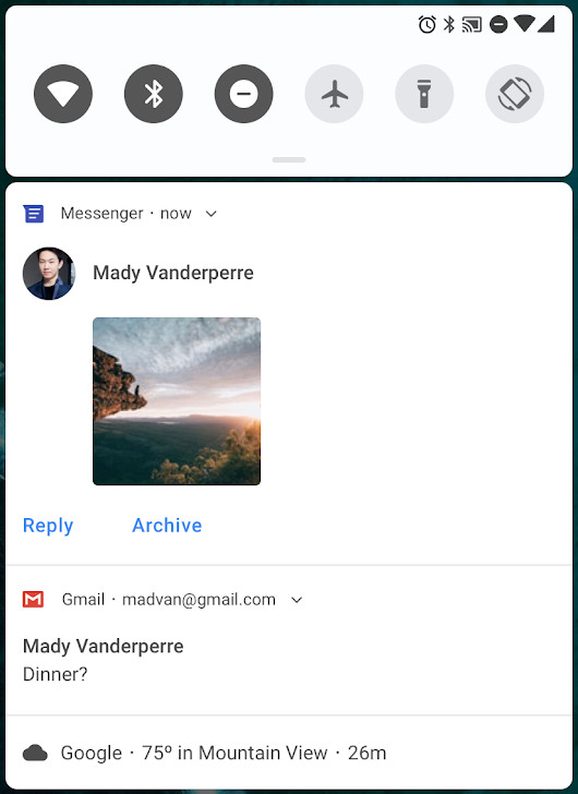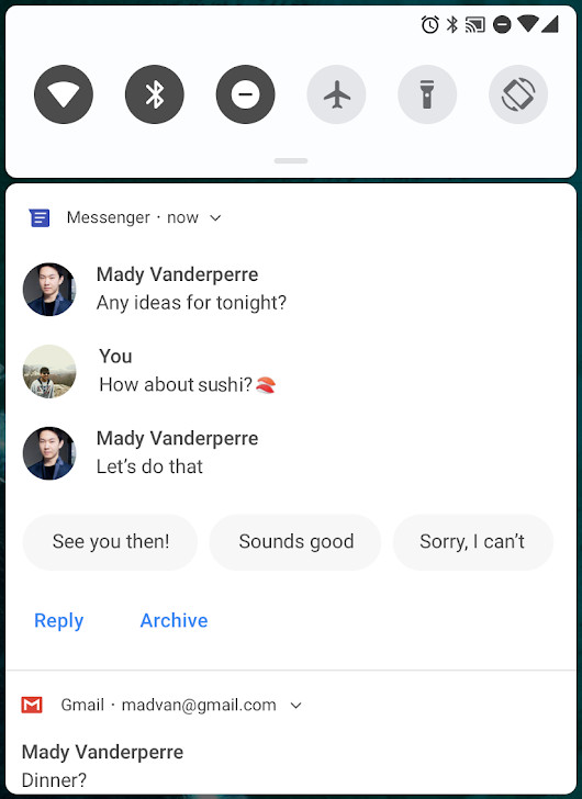 А щодо сповіщень, то їхній вигляд також зазнав певних змін. Там з’явився перемикач відображення повідомлень. Тобто, в Android 9 P з’явилася можливість сортувати повідомлення в шторці сповіщень. Окрім цього, також з’явилася можливість швидких відповідей.