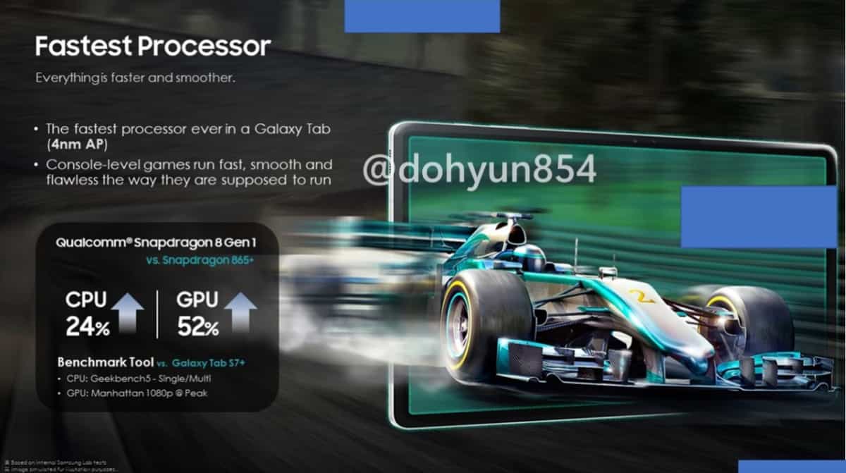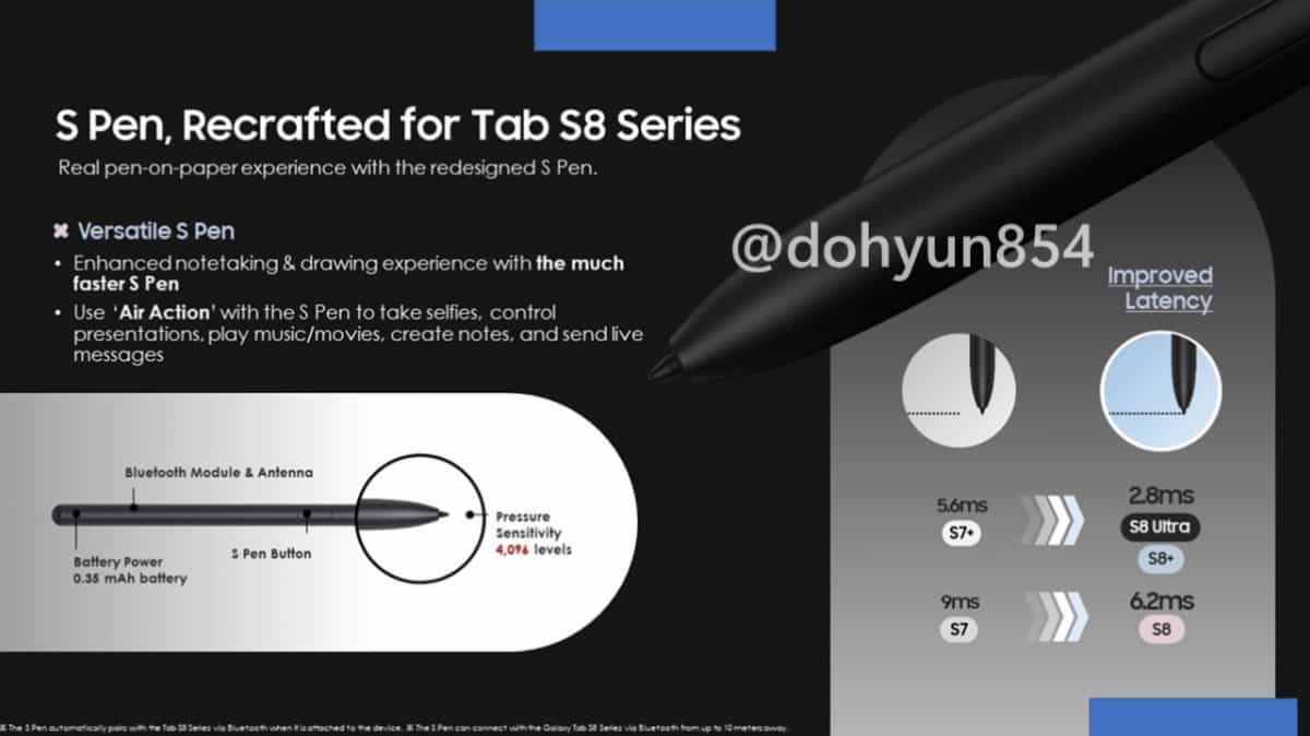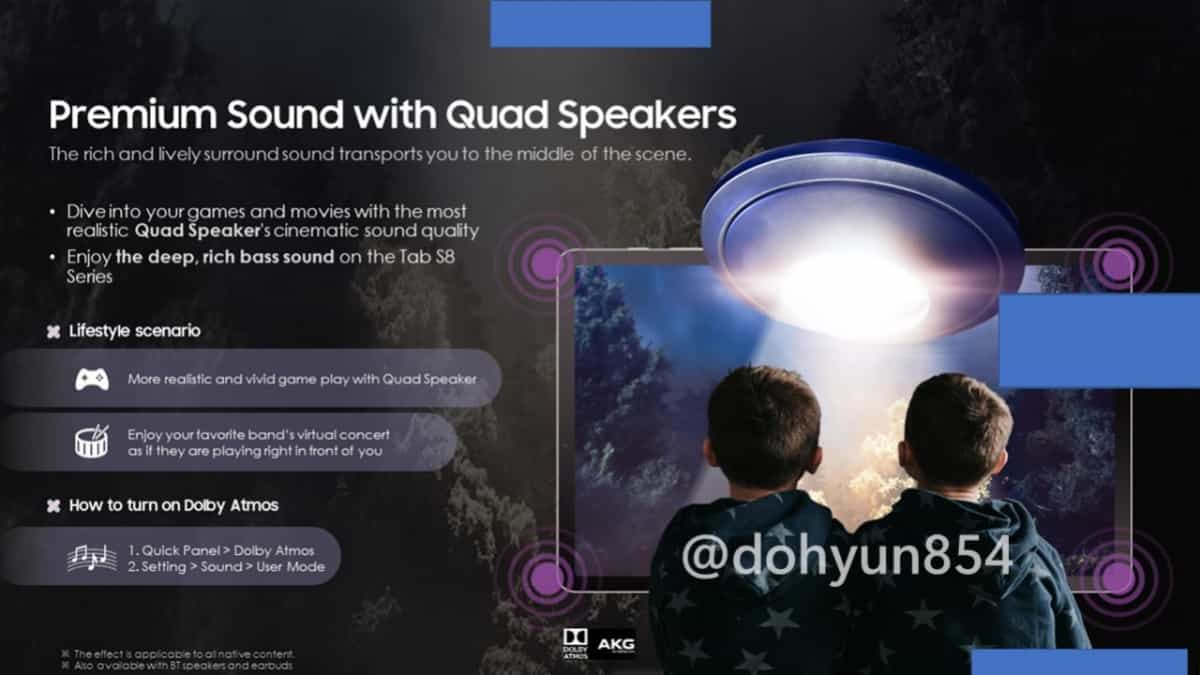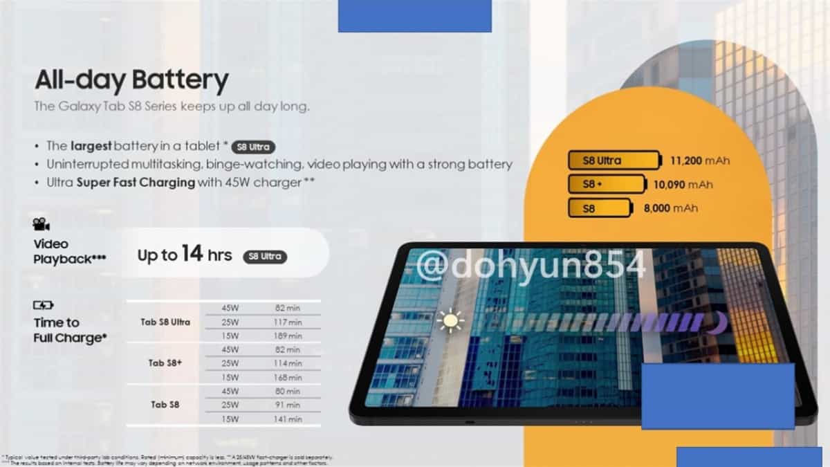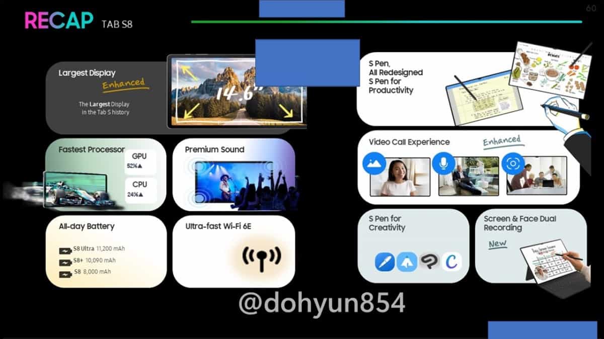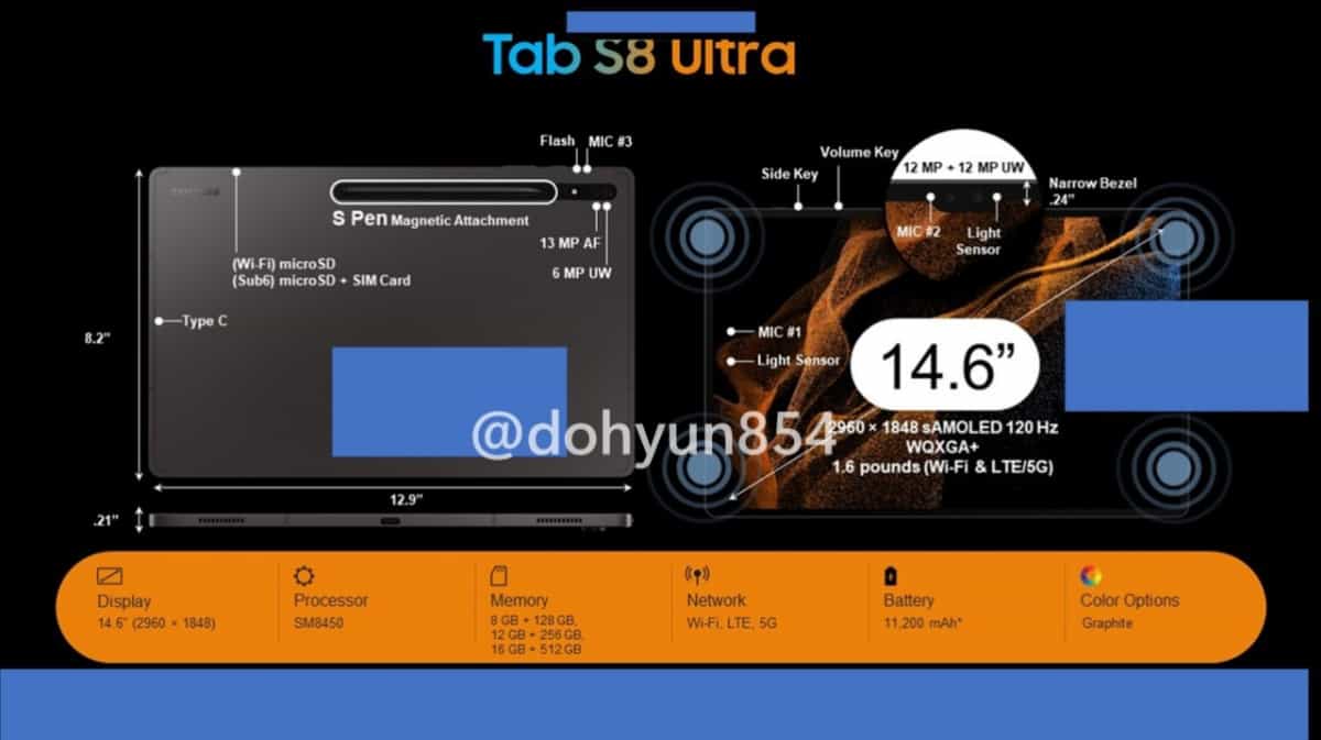 Інформатор із Південної Кореї, Дохюн Кім (Dohyun Kim) виклав рендери планшетів Galaxy Tab S8, Galaxy Tab S8+ та Galaxy Tab S8 Ultra. На вимогу компанії Samsung, із Twitter вже видалили усі зображення, проте вони однаково почали поширюватися інтернетом.