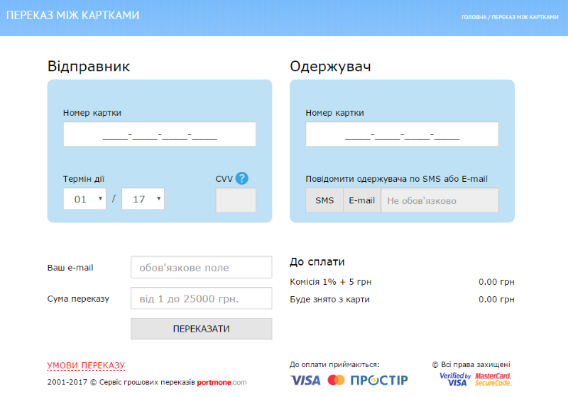 При цьому тарифи та обмеження на перекази такі ж, як і в усій цій системі. Перекази здійснюються тільки в національній валюті. При бажанні користувач також може отримати квитанцію. Комісія за переказ складає 1% + 5 грн. Ці кошти будуть стягуватися з картки відправника переказу разом із сумою переказу.