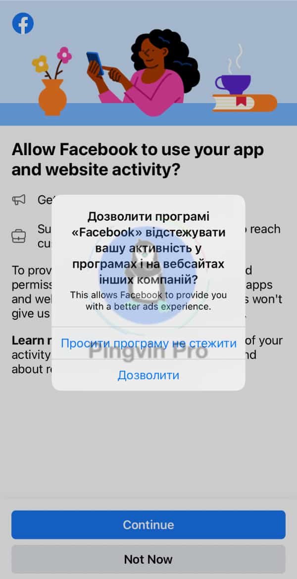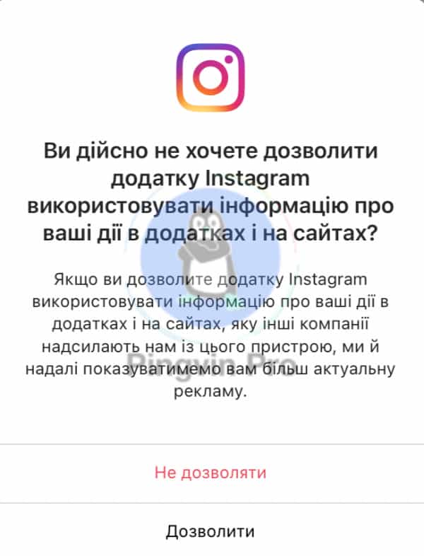 Сьогодні Pingvin Pro зауважив, що Facebook, який так активно виступав проти функції, та Instagram, що йому належить, почали показувати сповіщення. Вони питають ваш дозвіл на передачу їм даних з інших застосунків та сайтів. Цікаво, що на відміну від Instagram, Facebook досі не спромігся нормально перекласти всю свою платформу – застосунок, сайт і, навіть, Messenger! Досі присутньо дуже багато тексту англійською! В той час, як весь Instagram давно вже має повноцінний україномовний інтерфейс.