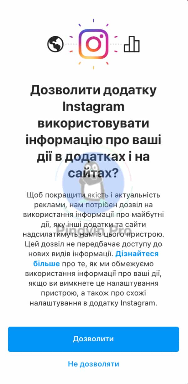Функція конфіденційності передбачає, що додатки мають питати ваш дозвіл на те, щоб інші сайти чи програми передавали їм дані про вас для показу релевантної реклами. Варто зауважити, що дані, які збиратимуться, не нові. Їх збирали і раніше, просто дозволу ніхто у вас не питав. Тобто, коли ви шукали, наприклад, у Google новий смартфон або чохол, то в тому ж Instagram починала з’являтися реклама чохлів зі знижками абощо.