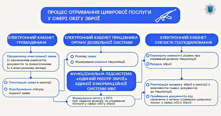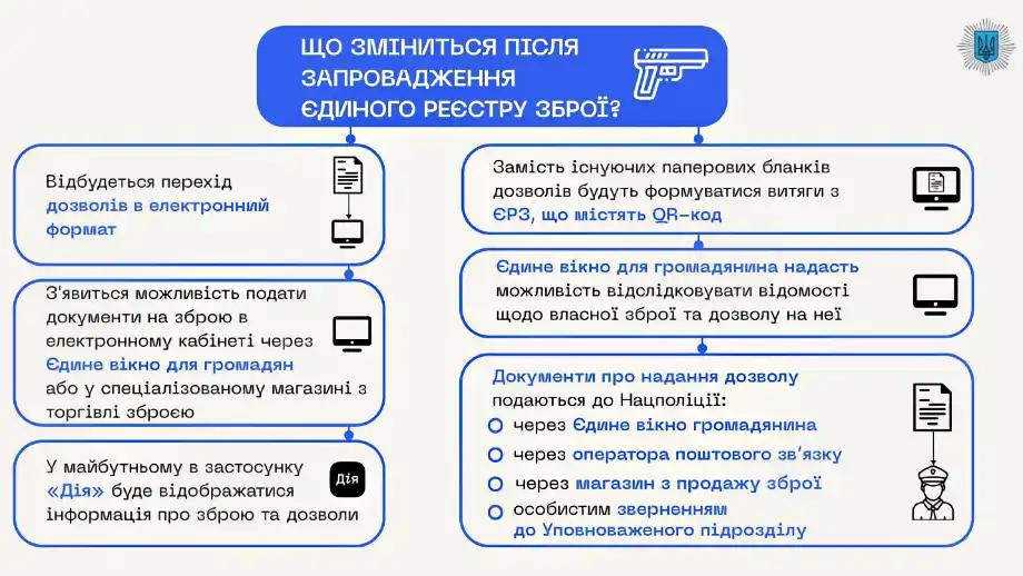 Єдиний реєстр зброї передбачає також створення Електронних кабінетів. Тож українці зможуть отримати послугу, не виходячи з дому, без відвідування органу Нацполіції, шляхом подачі документів через «Єдине вікно громадянина» або у магазині з продажу зброї.