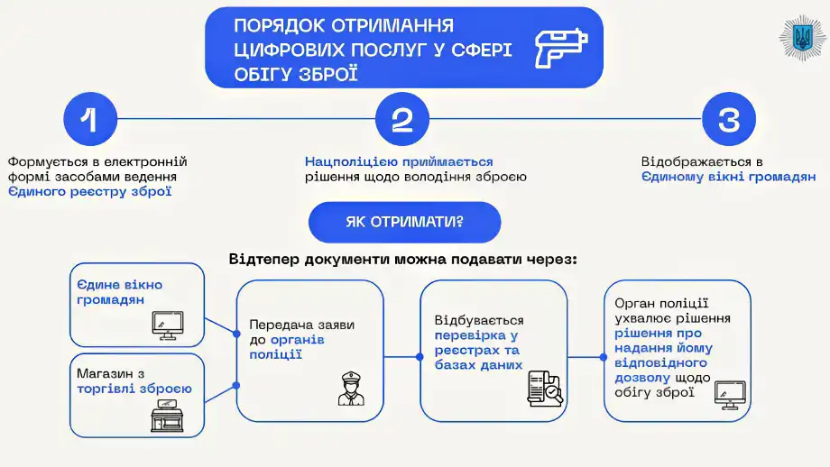 Єдиний реєстр зброї передбачає також створення Електронних кабінетів. Тож українці зможуть отримати послугу, не виходячи з дому, без відвідування органу Нацполіції, шляхом подачі документів через «Єдине вікно громадянина» або у магазині з продажу зброї.