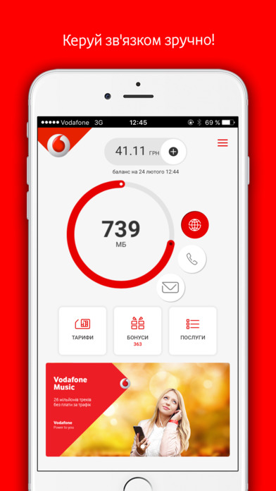 Найбільш затребувана інформація в додатку My Vodafone – завжди під рукою. В основному вікні My Vodafone відображається найбільш затребувана інформація у вигляді інфографіки про баланс рахунку, залишок мобільного трафіку, пакетних хвилин і повідомлень. Звідти ж можна дізнатися про кількість накопичених бонусів і обміняти їх на вигідні пропозиції від Vodafone.