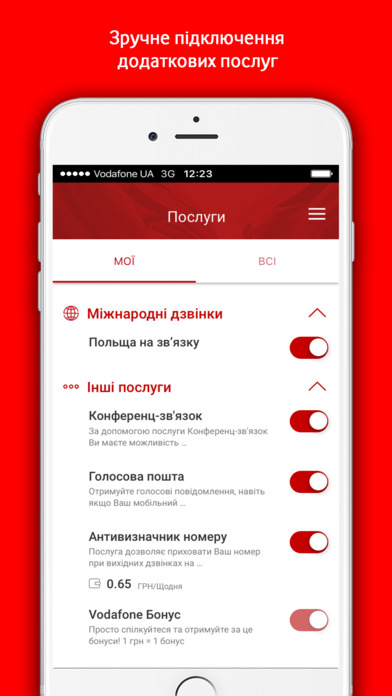 Додаток My Vodafone дозволить поповнити рахунок, дізнатися, подивитися де знаходиться найближчий центр обслуговування, завантажити інші додатки оператора, на кшталт Vodafone TV, Vodafone Music та Vodafone Books, і звісно дізнатися про нові послуги від Vodafone.