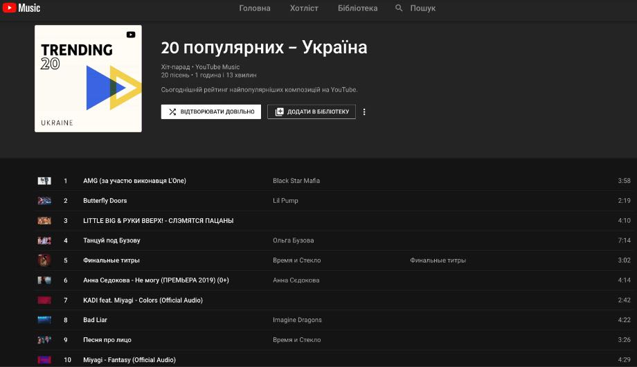 Для користувачів сервісу YouTube Music, який доступний в 29 країнах світу, з’явилися рейтинги. Завдяки ним, користувачі, в тому числі й українці, можуть дізнатися про найпопулярніші відео та пісні як у власній країні, так по цілому світі. Ці рейтинги створюються на основі кількості переглядів музичних фанів, яких вже понад 1 млрд і які відвідують сервіс щомісяця. Ось так виглядає перша 10-ка «Топ-100 композицій» в Україні.