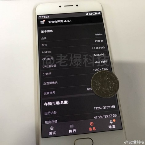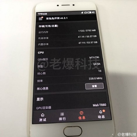 На фото видно його результати в бенчмарці AnTuTu, що проливає світло на ряд технічних характеристик смартфона. Так, підтвердилася роздільна здатність дисплея Full HD (1920 х 1080 пікселів), 10-ядерний процесор MediaTek MT6796, 4 Гб оперативної і 64 Гб вбудованої флеш-пам’яті, операційна система Android 6.0 Marshmallow.