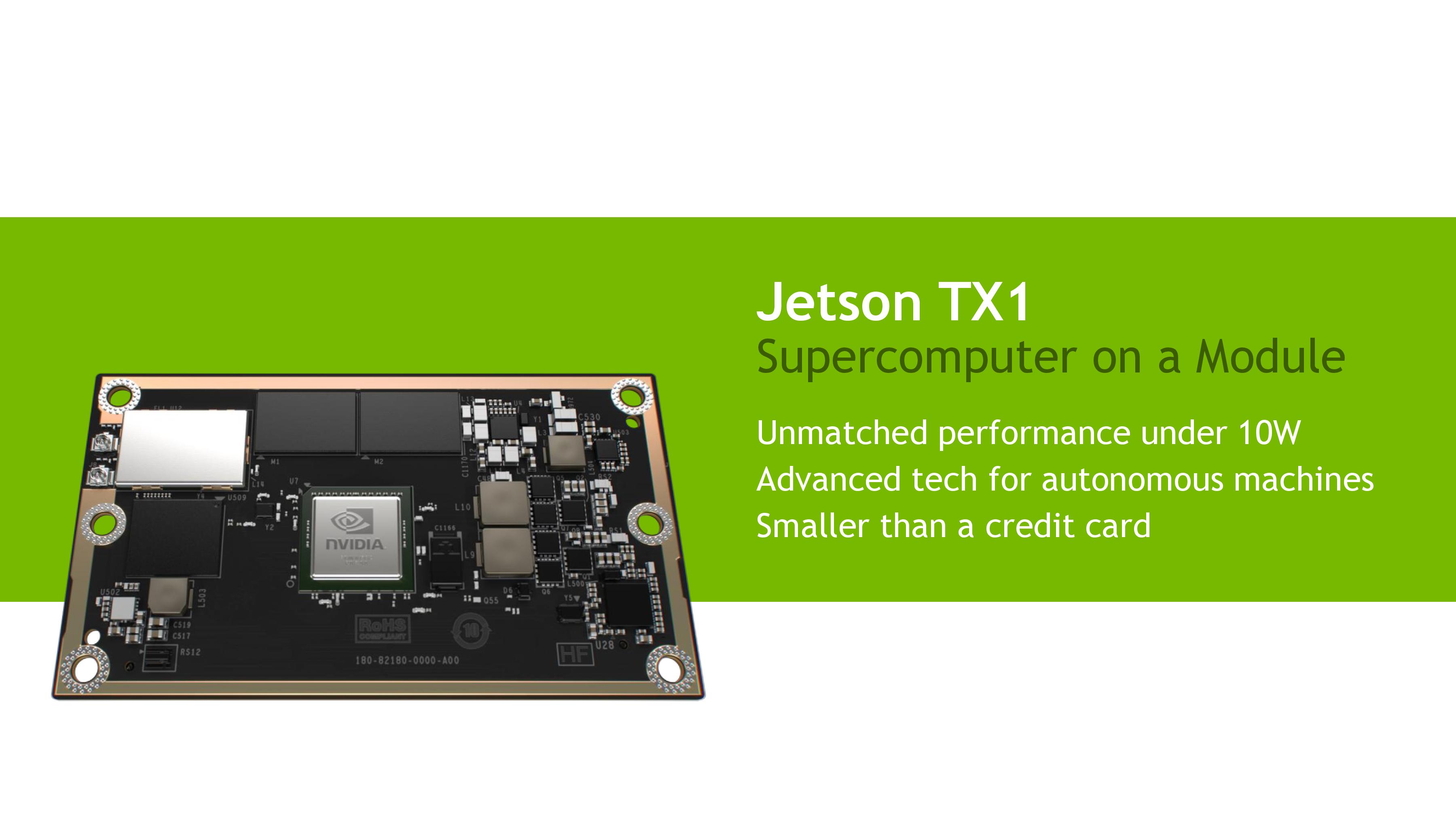Nvidia представила платформу Jetson TX1, призначену для використання в “розумних” автономних пристроях з можливостями машинного навчання. Компанія вірить, що на базі її модуля розміром з кредитну карту (87х50мм) можна створювати дрони, здатні самостійно прокладати шлях, компактні системи відеоспостереження, здатніих знаходити в натовпі людей підозрілих осіб, роботів, не просто виконують якісь завдання, але вміють підлаштовуватися під конкретні ситуації.
