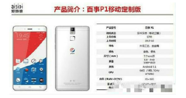 Але, схоже, що ця інформація повністю підтвердилася, а презентація першого смартфона Pepsi пройде вже 20 жовтня в Пекіні. Новинка отримає ім’я Pepsi P1 і зможе похвалитися досить непоганими технічними характеристиками, включаючи апаратну платформу MediaTek MT6592 з 8-ядерним процесором з частотою 1,7 ГГц, 2 Гб оперативної пам’яті і 5,5-дюймовий дисплей, що має роздільну здатність 1920 х 1080 пікселів. У смартфоні встановлений флеш-накопичувач на 16 Гб. Його блок камер представлений 13 Мп і 5 Мп сенсорами. Він працює на платформі Android 5.1, а в комплекті зі телефоном пропонується батарея на 3 000 мА*год. Вдалося дізнатися і вартість Pepsi P1, яка, як з’ясувалося, буде перебувати на рівні $ 205.