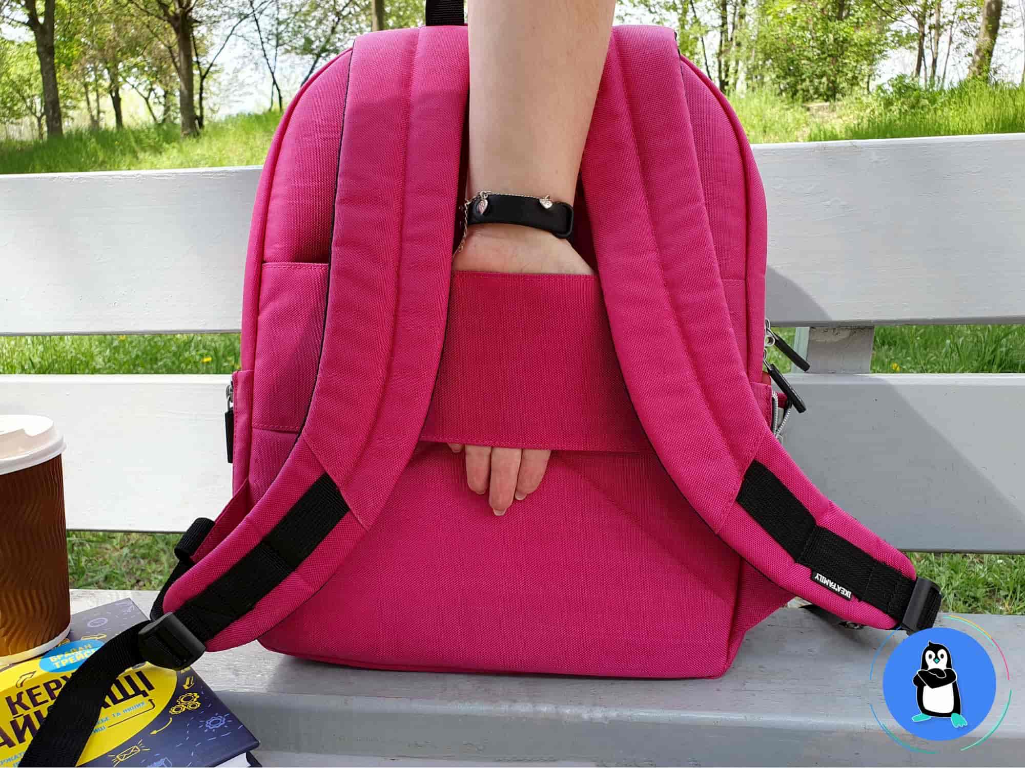 Спинка у рюкзака досить тверда, щоб не прогинатись. Але й водночас досить м’яка, щоб не тиснути на тіло. Рюкзак має широкі лямки, які допомагають комфортно розподілити вагу речей. Також ззаду є додаткова «лямка», за допомогою якої рюкзак можна зачепити за ручку валізи. Це важливий пункт, адже це рідкість для рюкзаків.