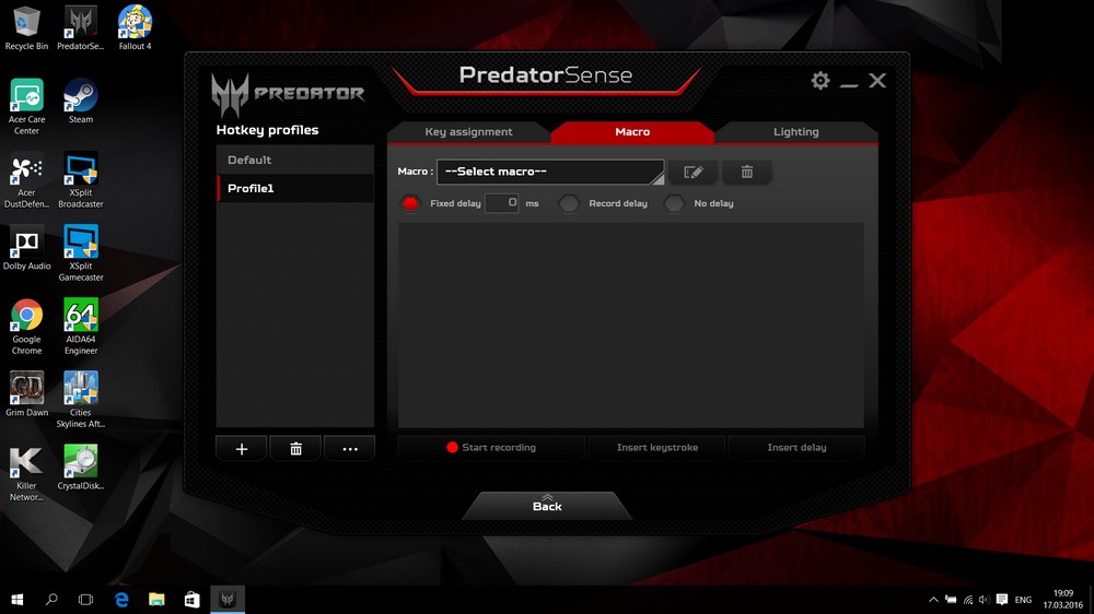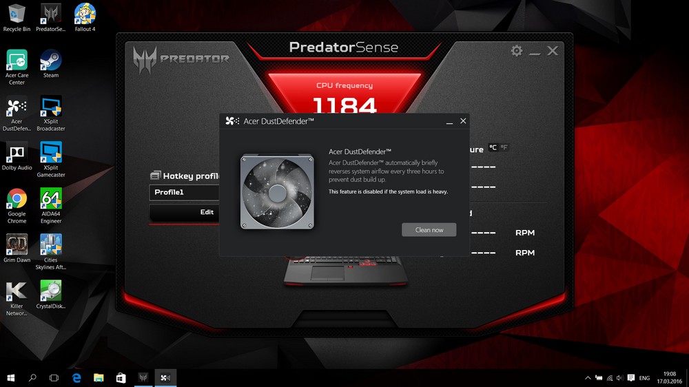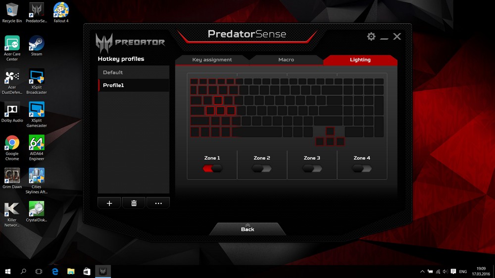 В комплекті із ноутбуком постачається фірмова утиліта Predator Sense, що дозволяє робити багато безперечно корисних речей, зокрема програмує додаткові клавіші на клавіатурі, керує чотиризонним підсвічуванням, хвацько гуде вентиляторами, показує їх оберти та температуру процесора та дозволяє записувати макроси із натиснень клавіш.