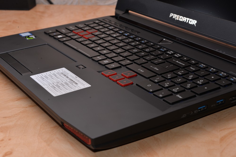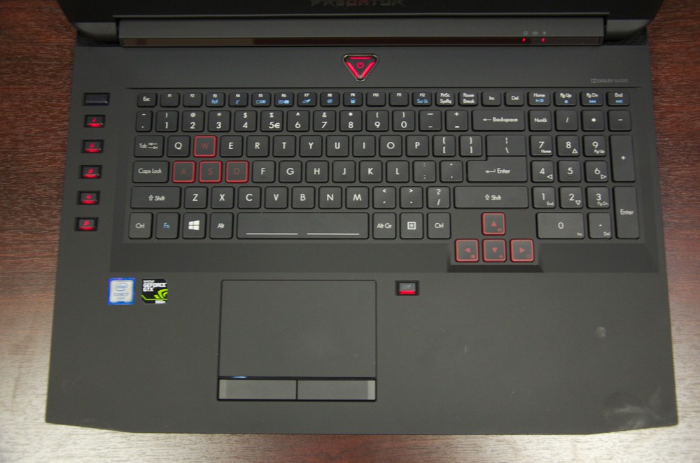 Ноутбуки серії Acer Predator оснащено повнорозмірною клавіатурою із цифровим блоком, чотиризонним підсвічуванням та досить довгим приємним ходом клавіш. Кнопки WASD та стрілки виділені червоним кольором. Яскравість підсвічування не регулюється. Наявні п’ять програмованих клавіш і шоста кнопка перемикання режимів. У 15″ моделі вони знаходяться над алфавітно-цифровим блоком, у 17″ зліва.