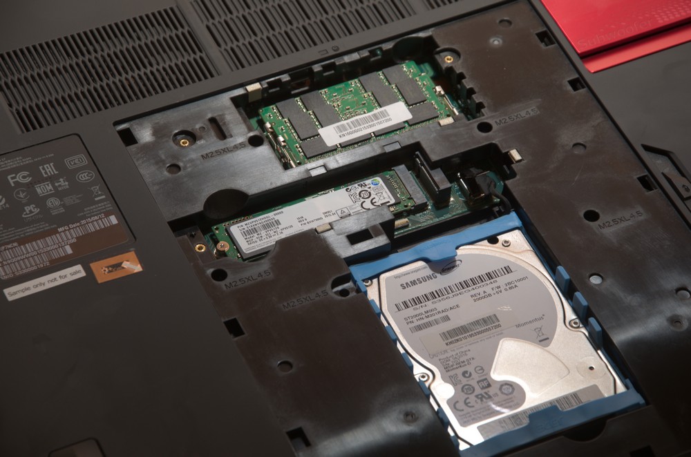 Іще можна побачити два гнізда SATA.M2 для SSD, що дозволяє робити системний носій в RAID і досягати іще більшої швидкодії. HDD заключений у гумову оболонку для амортизації.