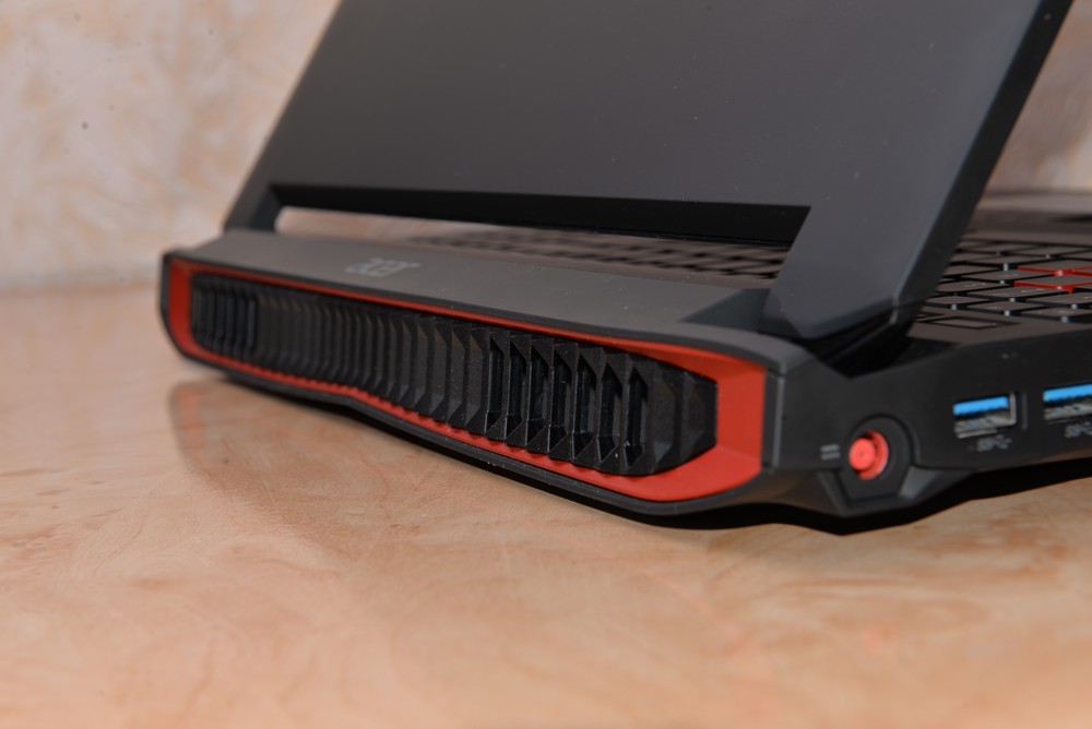 Друге, що ми бачимо – великі гратки вентиляції на задньому торці ноутбука. У нього два вентилятори, один на процесор, інший на відеокарту, вони оснащені системою Acer DustDefender, що періодично, у разі відсутності великого навантаження, вмикає вентилятори на повну потужність у зворотньому напрямку і видуває втягнену пилюку.