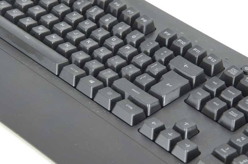 Клавіші мають стандартні ковпачки, тому із G213 нормально не тільки грати, а й працювати із текстом. Хід великий, момент натискання майже не відчувається. Клік не гучний, відчувається, що підкладка пластикова. Шрифт на клавішах стандартний, звикати не доводиться. У оглянутому екземплярі відсутні українські літери.