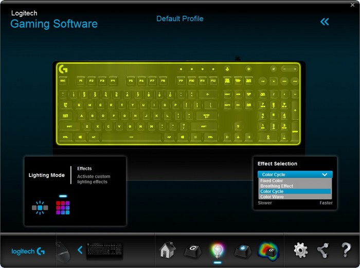 Підсвічування у G213 Prodigy чотиризонне. Ви можете змінювати колір як всієї клавіатури, так і окремо її частин. Можна ставити будь який суцільний колір, або виставляти ефекти зміни кольору.