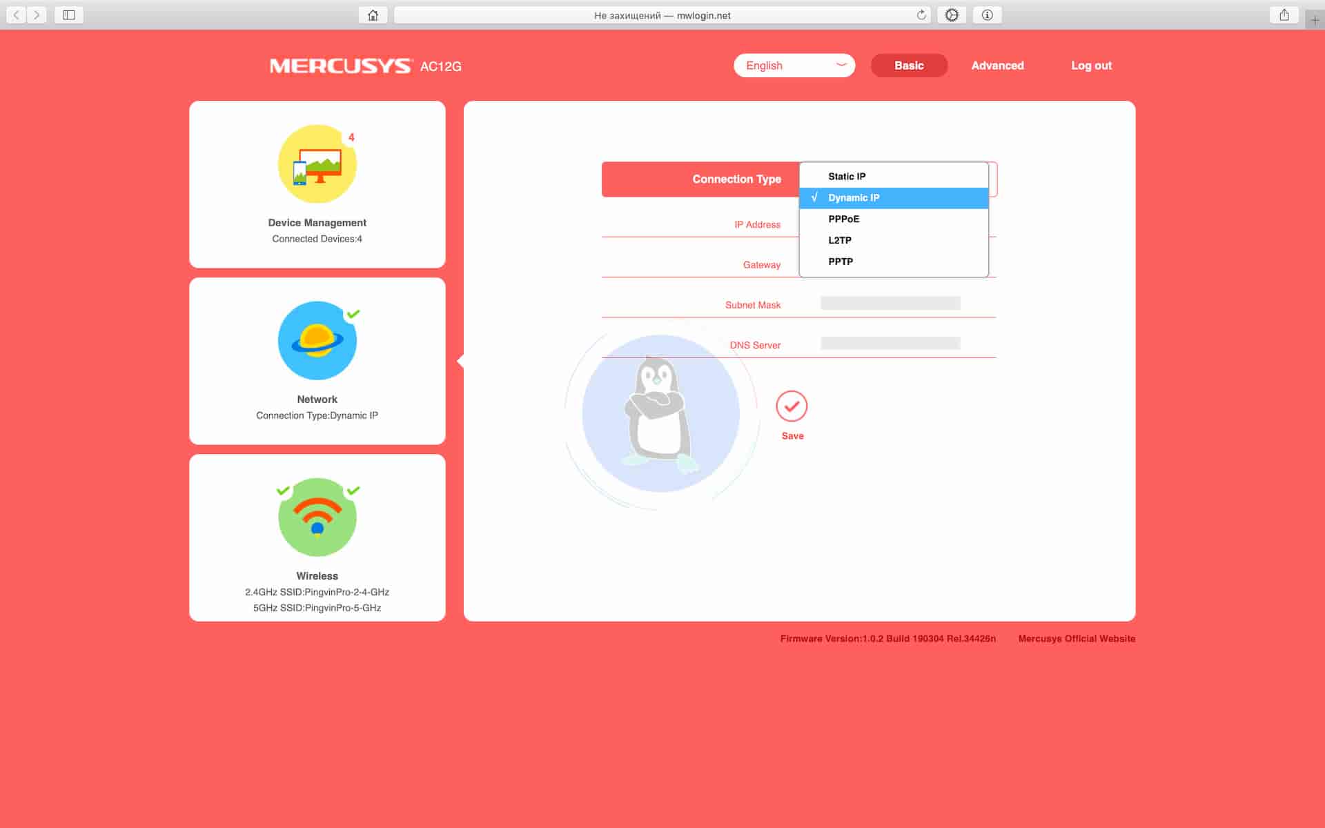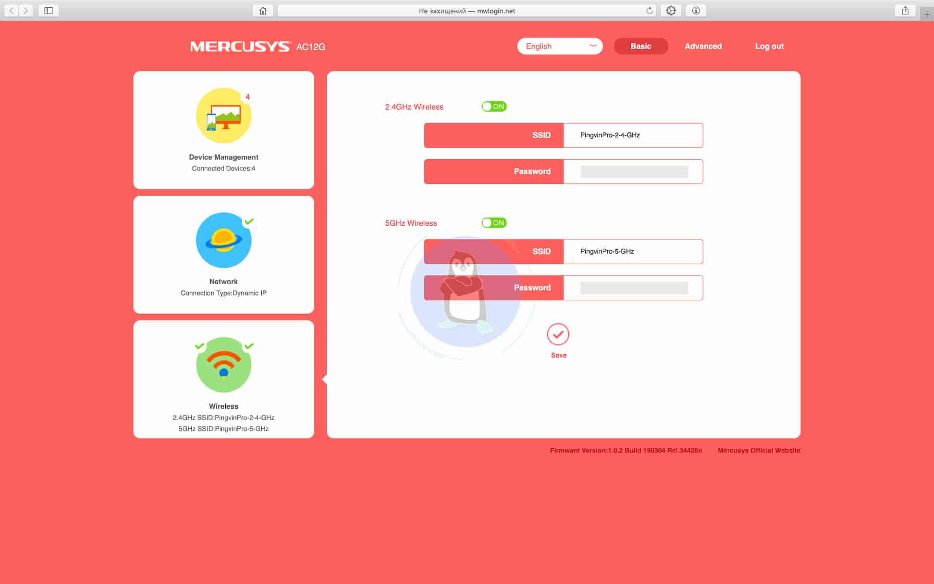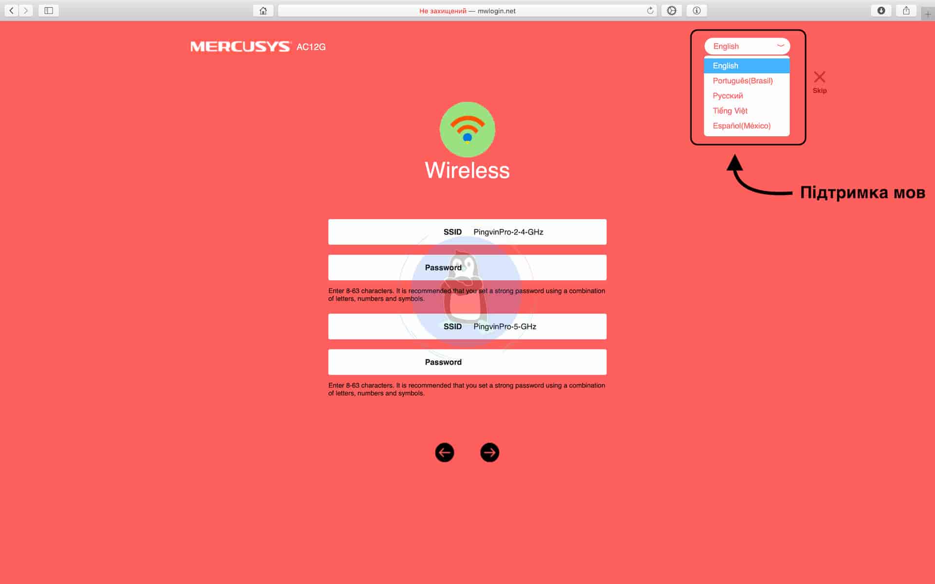 Ця сторінка може не відразу завантажитись, так що доведеться трішки зачекати. В іншому випадку, якщо у вас щось не вантажиться, значить може бути якась проблема. Потім треба назвати Wi-Fi точки на частотах 2.4 ҐГц і 5 ҐГц, для прикладу PingvinPro-2-4-GHz та PingvinPro-5-GHz і встановити на них паролі. І це всі головні налаштування роутера. До речі, серед підтримуваних мов є лише англійська, португальська, російська, в’єтнамська та іспанська. Української, на жаль, нема.