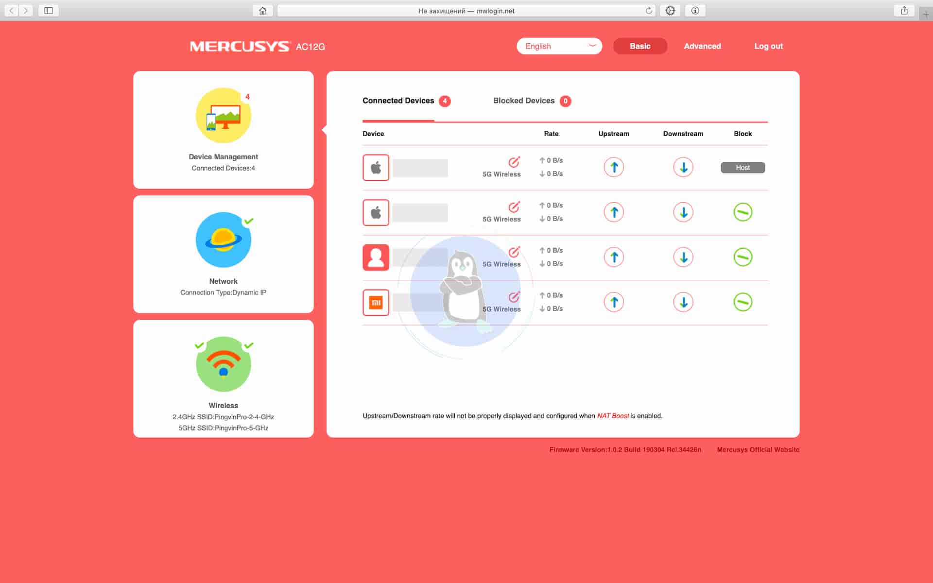 В налаштуваннях роутера доступно два режими: базові налаштування та розширені налаштування. Базові налаштування містять найголовніші функції, які потрібні для звичайних користувачів. Тут можна побачити усі пристрої, які підключені до інтернету через дротове або бездротове підключення (2.4 ҐГц і 5 ҐГц). Усі підключені пристрої можна перейменувати так, як вам це буде подобатися. Також тут відображається інформація про швидкість завантаження та відвантаження даних через інтернет у байтах за секунду, що, як на мене, є дуже зручно. Окрім цього, можна заблокувати якийсь пристрій. Також в базових налаштуваннях доступна інформація про тип підключеної мережі та інформація про бездротовий доступ до інтернету через 2.4 ҐГц і 5 ҐГц частоти. Там же можна змінити назву точки доступу, побачити пароль або змінити його, і також можна відключити мережу Wi-Fi, яка вам зараз непотрібна. Для прикладу, можна відключити Wi-Fi точку з доступом на 2.4 ҐГц.