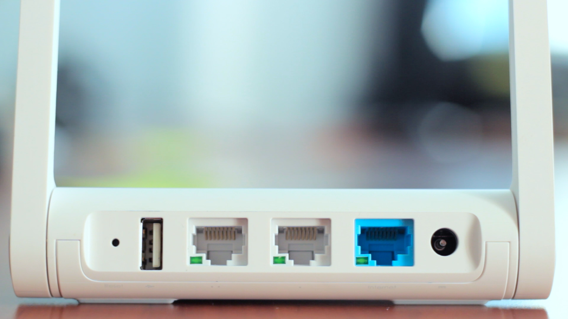 Позаду ж розмістили все що нас може цікавити. Тут глибоко втоплена і дуже туга кнопка скидання налаштувань, один USB-порт, три Rj45, та роз’єм живлення.