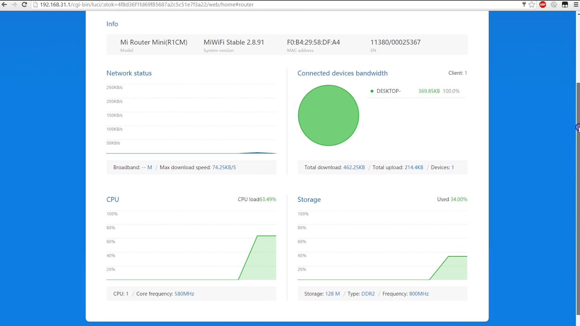 Тепер що до інтерфейсу. На домашній сторінці тут вся статистика по підключенню та навантаженню, як на мережу так і на залізо, в тому числі і процесор з оперативкою.