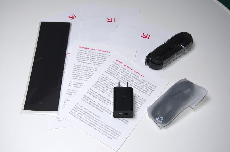 Окрім об’єктивів та акумулятора до комплекту входять інструкції англійською та китайською мовами, USB-кабель, ремінець на шию, та блок живлення без перехідника на наші розетки. Схоже, що ми маємо справу із дуже великим струнно-смичковим інструментом.