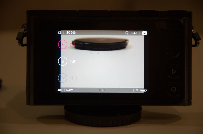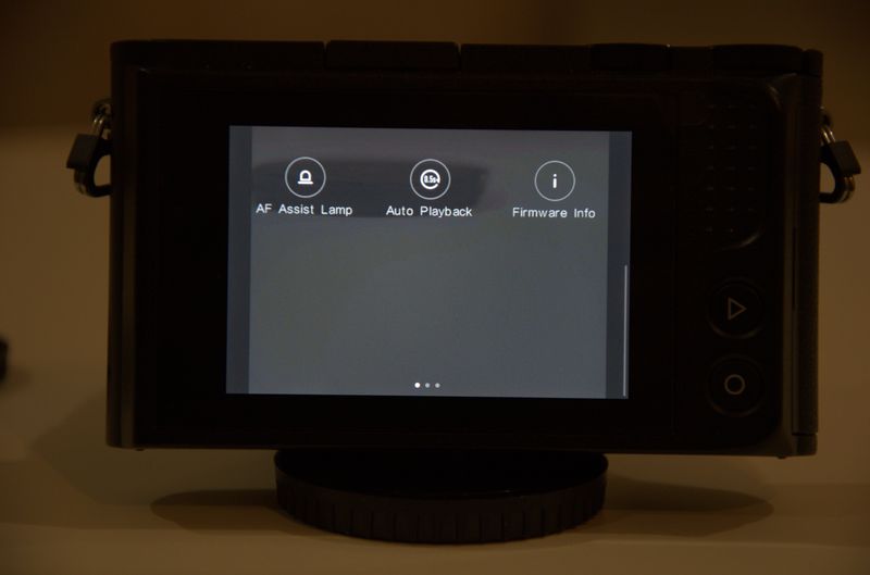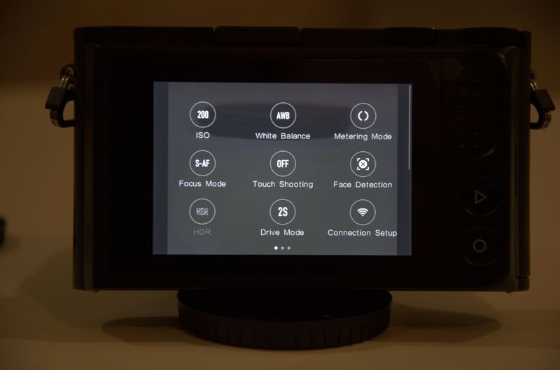 Керування камерою організовано на трьох екранах, що перемикаються горизонтальним протягуванням. Центральний — екран зйомки, на ньому видно зображення, основні параметри, заряд акумулятора, режим роботи експовиміру та фокусування, баланс білого, формат запису та зона фокусування. Ліворуч знаходяться віртуальні кнопки, що відповідають за діафрагму, витримку та еспопоправку — натиснувши їх ви можете міняти відповідний параметр командним диском.