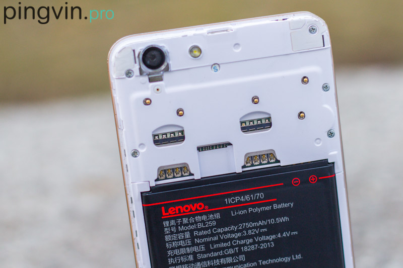 Модуль камери й світлодіодний спалах розташовані у верхній смузі пристрою, там же розташовується крихітний отвір мікрофона. У нижній смузі смартфон має дві решітки динаміків з пафосним “шільдиком” Dolby. Кришка легко знімається, але в той же час сама по собі не відходить. Ви отримуєте доступ до акумулятора і гнізд для карт розширення. Є три: два для сім-карт стандарту micro й одне для карт пам’яті, також micro, але тут уже micro-SD.