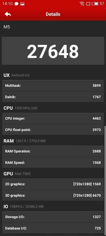 Що стосується заліза, то M5 оснащений бюджетним чіпом початку 15-го року, Mediatek MT6750, в якому лохматить одразу 8 ядер: чотири Cortex-A53 з частотою 1.5 GHz та чотири Cortex-A53 з частотою 1 GHz. Іграшки бере на себе графіка Mali-T860 MP2, де MP2 означає що це двох ядерна. Чіп здатний працювати на частоті до 700МГц. У MT6750 він працює на частоті 650МГц. За продуктивністю можна порівняти з Adreno 405, або з двох ядерної версією Mali-T628, її вистачить для запису та відтворення FullHD роликів, що власне ми і бачимо у налаштуваннях камери.