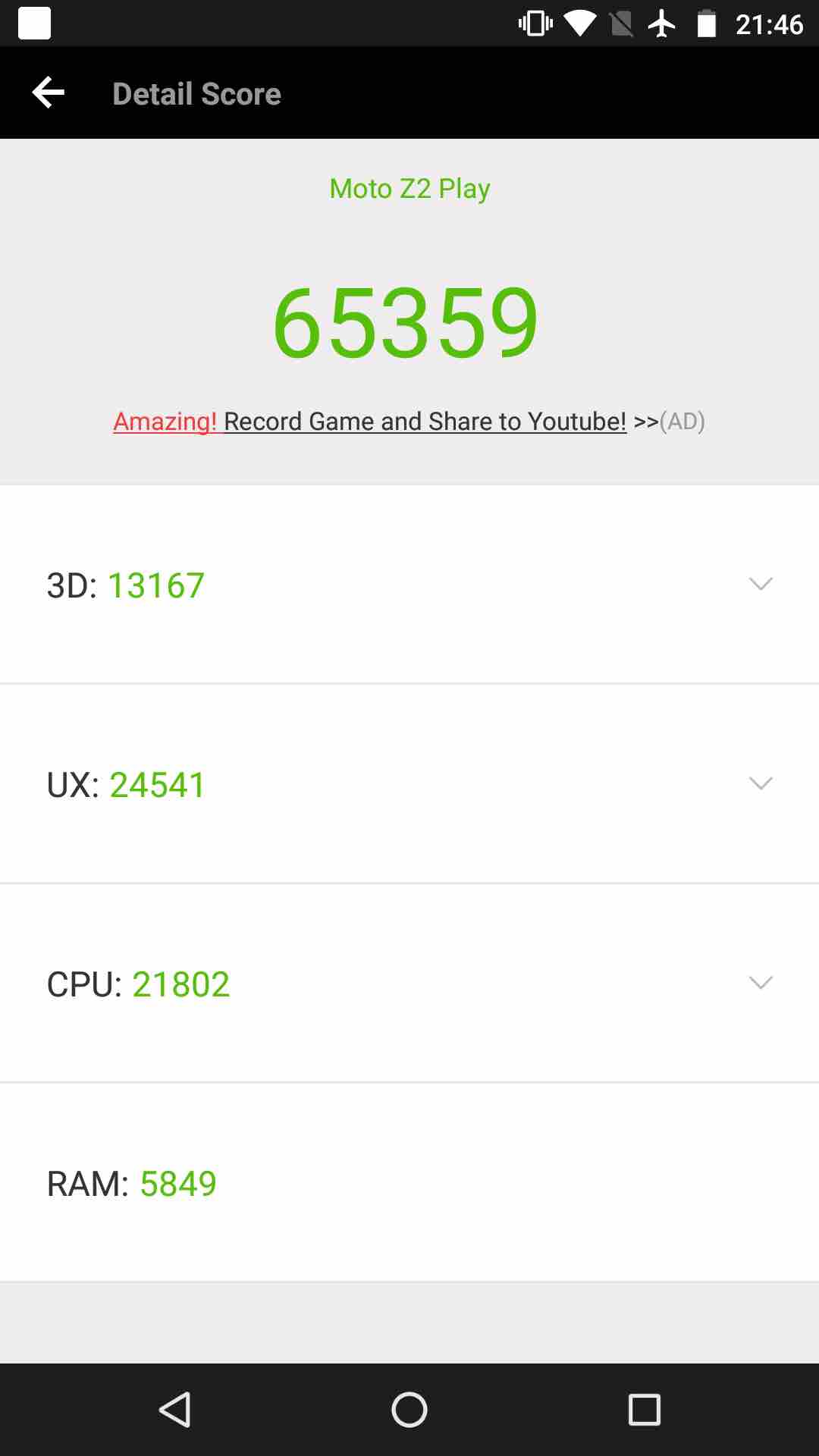 Тилова камера у Motorola Moto Z2 Play на 12 Мп з апертурою f/1.7. Фотографії виходять дуже непоганими при будь-якому освітленні на автоматичних налаштування. Навіть в темряві, знімки не сильно заходять в шуми. В мудрофоні є режими професійного знімання та панорама. При зніманні, Motorola Moto Z2 Play підтримує 4К відео. Фронтальна камера нічим не здивувала. Просто варто сказати, що вона хороша середньостатистична камера і більше нічого особливого в ній нема. Оригінальні фотографії камер можна глянути за цим посиланням.