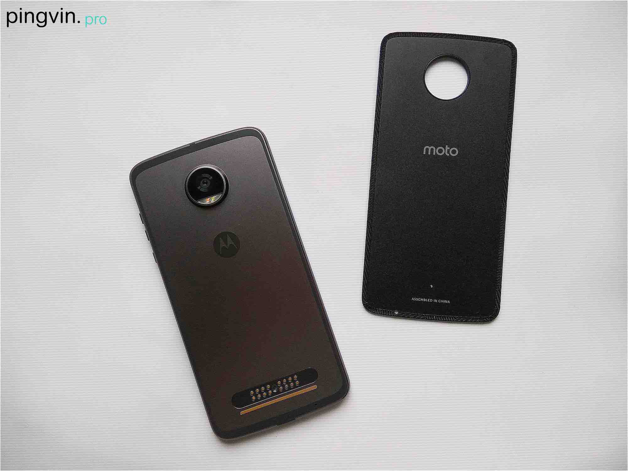 На тиловій частині, по середині, зверху є масивна тилова камера разом із здвоєним спалахом, яка випирає на добрячих таких 2 мм. Цього фактично не помітно, якщо на смартфоні буде задня захисна кришка. Трохи нижче камери є логотип компанії, а в самому низу є ще один (вже другий) мікрофон. Знявши дуже приємну на дотик кришку, що приєднується до смартфона за допомогою магнітів, можна побачити в самому низу конектори, завдяки яким можна під’єднати різні модулі від Motorola.