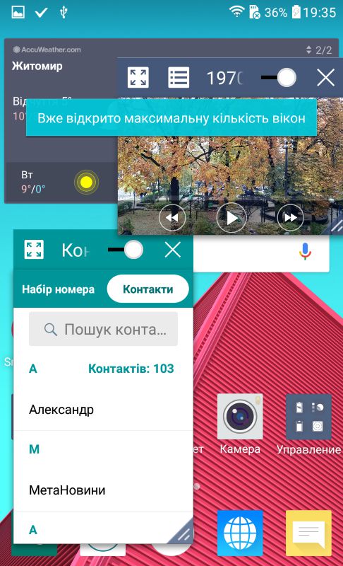 Як і раніше, доступна фірмова опція KnockOn, що включає і вимикає екран після подвійного тапа по ньому, а також функція безпеки Knock Code для розблокування пристрою персональної комбінацією тапов по дисплею. У свою чергу, Glance View дає можливість побачити на вимкненому екрані рядок стану, час і дату, для цього потрібно просто свайпнути зверху вниз. За допомогою QuickMemo + легко створювати нотатки прямо під час телефонної розмови. А ось Qslide допомагає на будь-якому екрані додатково розмістити до двох вікон з додатками з відповідного списку (відеоплеєр, браузер, пошта, менеджер файлів і т.д.). При цьому, вікна цих програм можна переміщати по екрану, міняти їх розмір і налаштовувати прозорість.