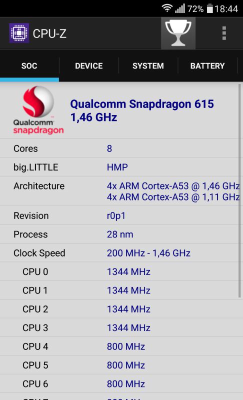 | Процесор | 8-ядерний процесор Snapdragon 615, що працює на максимальній тактовій частоті у 1,5 ГГц, в парі з графічним відео-прискорювачем Adreno 405 |