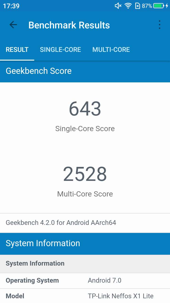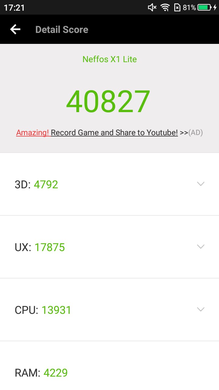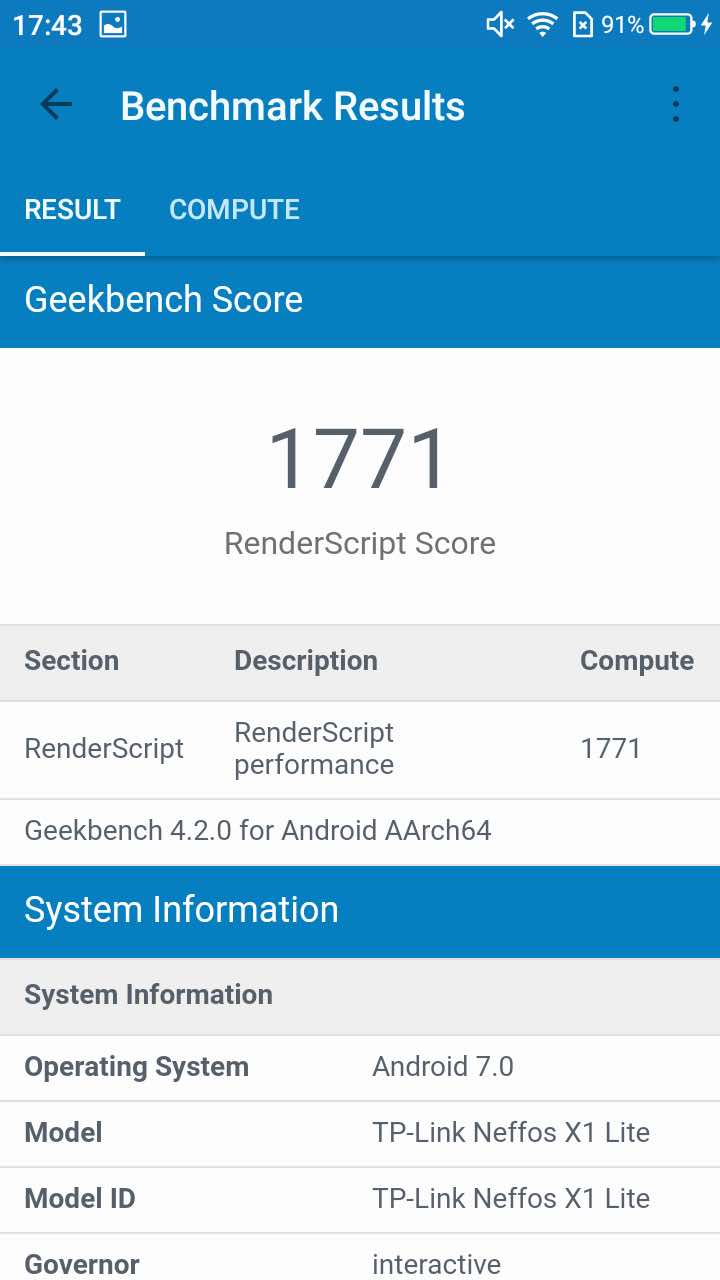 В Neffos X1 Lite є не дуже просунуте залізо, однак його вистачає для повсякденних задач. Так, процесор MediaTek MT6750 показує відносно низькі показники у різних тестах бенчмарків. Але, як на диво, завдяки добре оптимізованій системі, усе працює дуже непогано. В ролі графічного чіпу є ARM Mali-T860MP2 потужність якого оцінюється у 35.3 Gflops. З цього можна зробити висновок, що цей мудрофон далеко не для ігор. І так воно і є. Проте, у щось дуже простеньке пограти можна буде.
