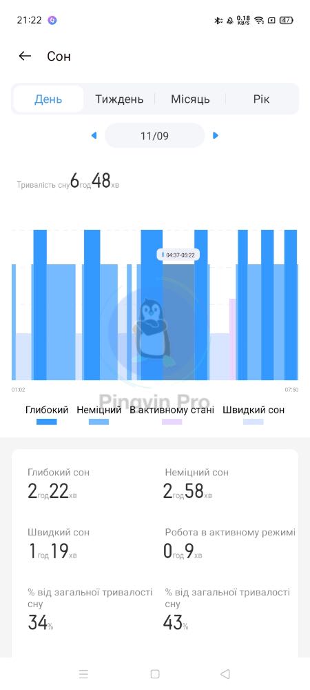 - моніторинг сну: достатньо просто спати з годинником, він сам фіксуватиме фази сну та неспання. Вранці він видасть Вам графік, де позначить кожну фазу та загальний час сну.