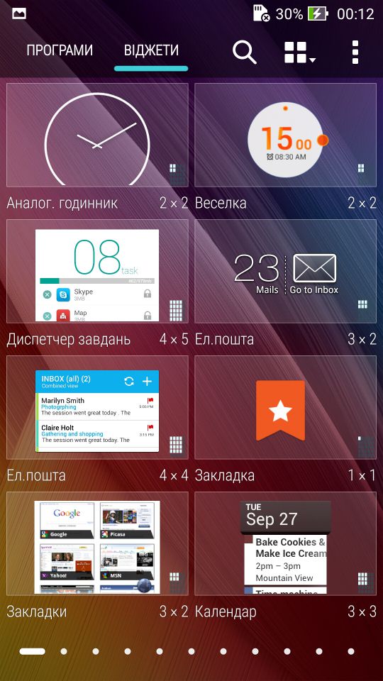 Далі меню. Воно тут розділено на програми та віджети. Також є пошук, що згодиться любителям захламити смартфон купою додатків а потім їх шукати. До речі відразу відмічу, і тут це гарно помітно, що з локалізацією є певні проблеми, наприклад такий символ як апостроф, смартфон взагалі не розуміє, а переклад в цілому, думаю робили гугловим перекладачем, і не заморочувались що до перевірки, адже ряд слів, по типу безкоштовної оперативної пам’яті, або настройки замість налаштувань (What Next), виглядають безглуздо… В деяких місцях, до речі, як у налаштуванні фонових малюнків, переклад на українську взагалі відсутній, в той час як з російською таких проблем немає.