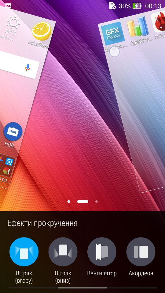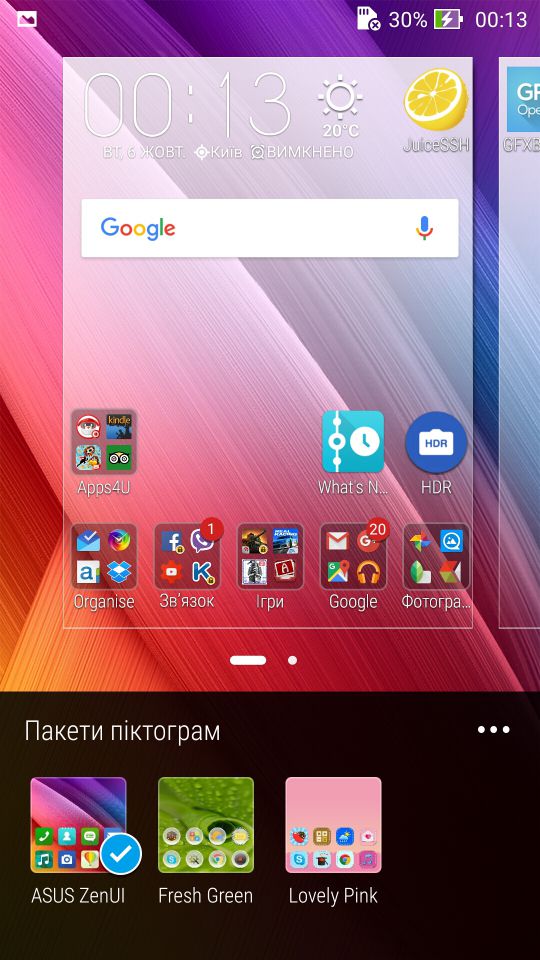 Отже, як я сказав, оболонка ZenUI дуже і дуже легко піддається кастомізації. Тож розпочнемо саме з зовнішнього вигляду, та можливостей що до його зміни. І перше за що чіпляється погляд це значки переважної більшості додатків, звісно вони тут виконані в одному стилі, і не далеко втікли від класичного стилю Android, але з закругленими кутами, та ефектом LongShadow. Іконки до речі можна змінювати, але про це пізніше. Налаштування робочих столів реалізовано класичним жестом (щіпок), після чого можна додати новий робочий стіл, видалити існуючий, але найцікавіше, це можливість зберегти, або ж відновити вже налаштований раніше робочий стіл.