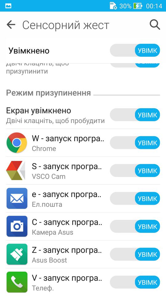 З загальним виглядом закінчили, перейдемо до утиліт додатків та цікавих можливостей оболонки. На всіх звісно зупинятись не буду, адже їх тут занадто багато. Перше, це Zen Motion. Тут налаштовується функціонал жестів на заблокованому дисплеї. Тобто якщо подвійний тап по екрану розблоковує смартфон, то намалювавши певну літеру, ви можете відразу потрапити у потрібний додаток. Наприклас С – це камера, а W – це браузер. Додатки для запуску звісно можна змінювати, на будь-які з встановлених на вашому пристрої.