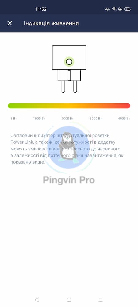 Зелений-жовтий-червоний світиться пристрій активовано в додатку Perenio Smart і він споживає енергію, при цьому колір плавно змінюється в залежності від сили струму – від 0А (зелений) до 16А (червоний)