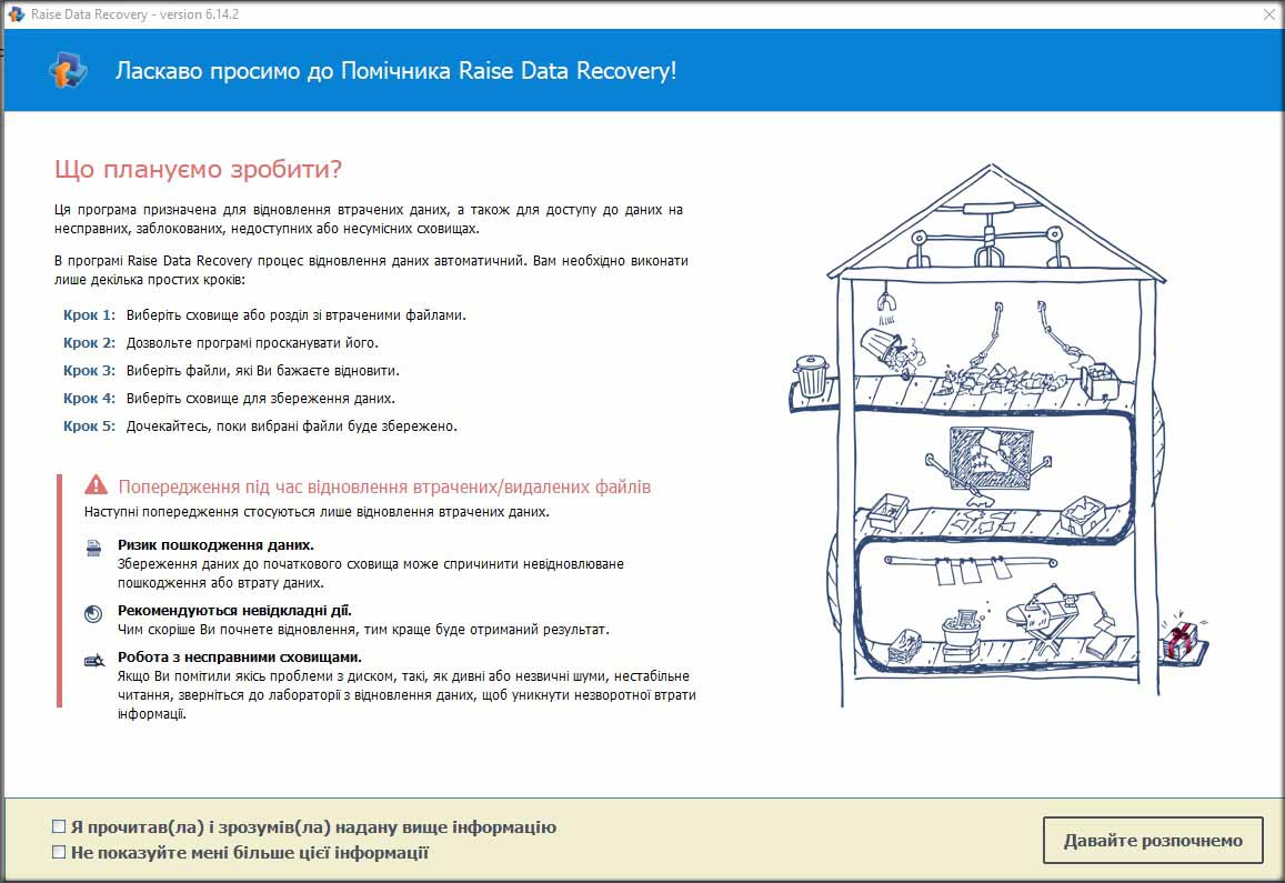 - Екран привітання Raise Data Recovery