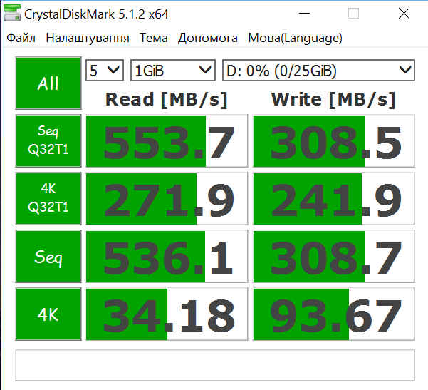 Системний SSD ємністю 256 ГБ показав нормальні результати для свого рівня. Виробник для чогось робив його на два розділи — основний C із системою та усім іншим та додатковий D, в якому не було нічого.