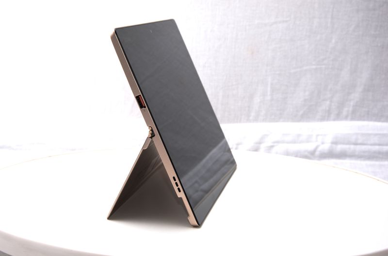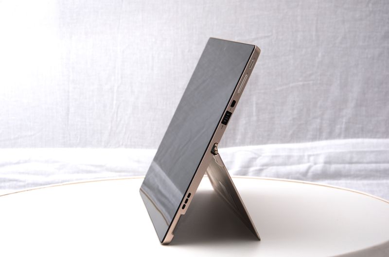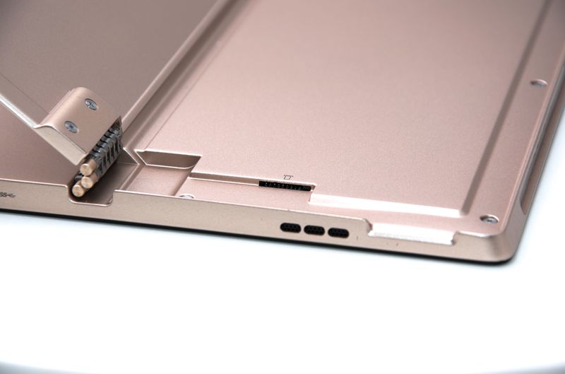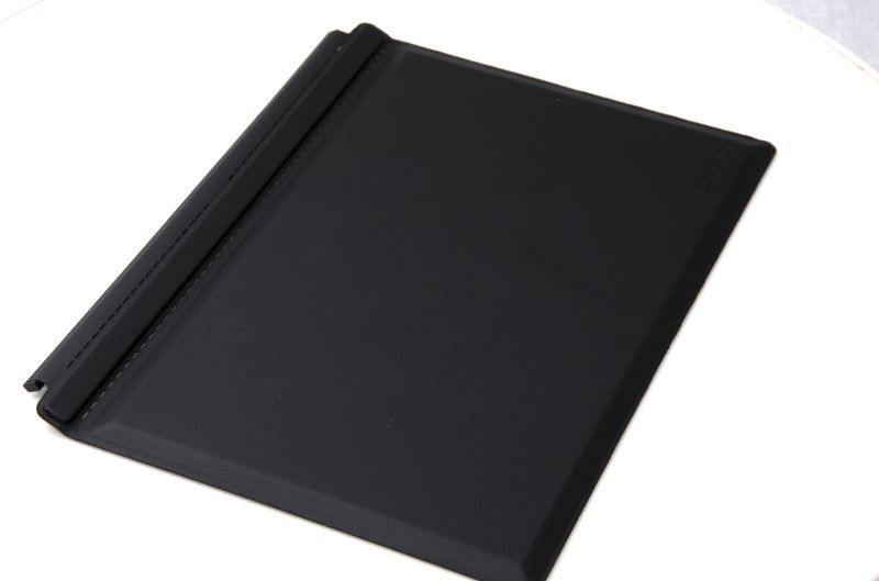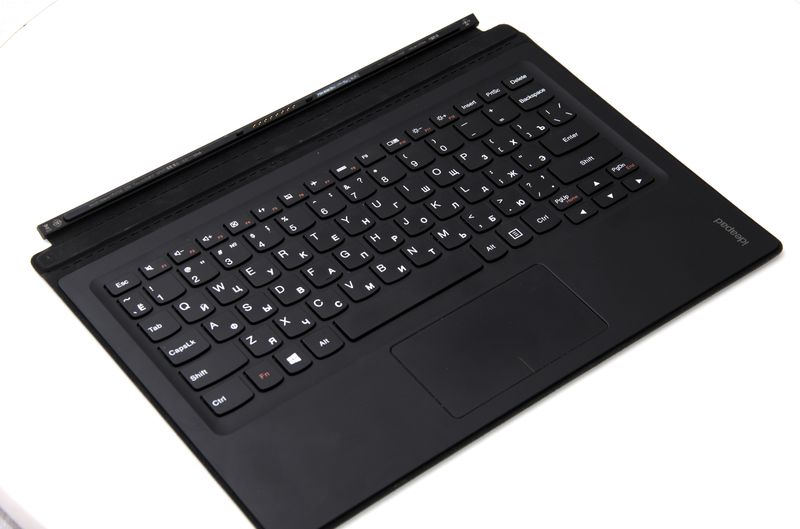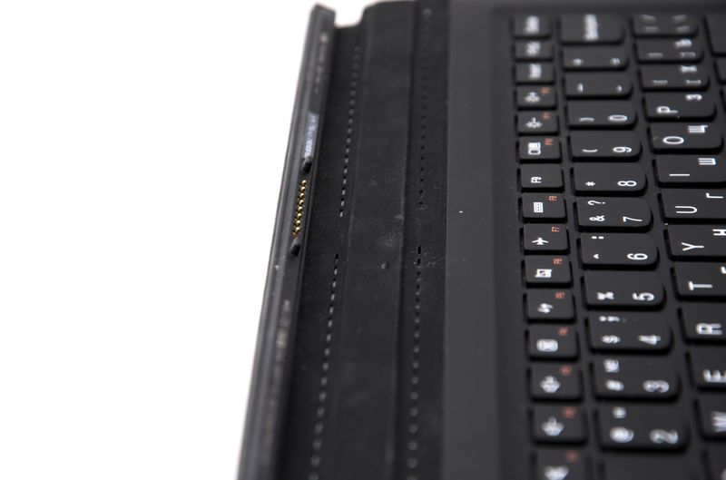 Клавіатура-обкладинка підключається за допомогою роз’єму в нижній частині планшета та завдяки вбудованим магнітам робиться це швидко та легко. Але оскільки в конструкції не передбачено ніяких шарнірів, що триматимуть потрібне положення, тому щоб планшет стояв на поверхні, ззаду є поворотна підставка.
