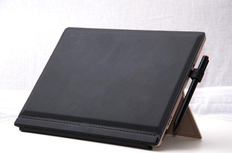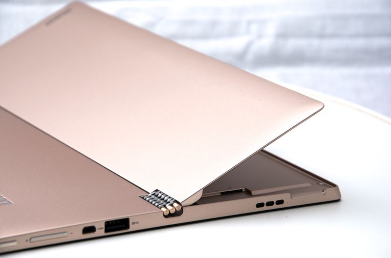 Вона зроблена у вигляді пласкої пластикової пластини, прикріпленої до корпуса оригінальними з’єднаннями, такими, що використовуються у Yoga 900s. От тільки на відміну від Йоги, тут вони виглядають дещо недоречно, хоча цілком практичні.