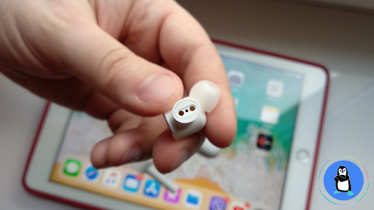 В середині кейсу є два бездротових навушника, які міцно тримаються в кейсі також завдяки магнітам. Навіть якщо перевернути кейс і відкрити кришку, навушники не випадуть. Виймають вони легко та просто. Самі навушники також виглядають стильно та дорого, як і їхній кейс. На кожному з них є по одному світловому індикатору білого кольору, по одній сенсорній кнопці, по два конектори для зарядки та по два мікрофони. Один мікрофон (нижній) розрахований для розмов, а інший (передній боковий) є для заглушення фонового шуму під час розмов. Також на внутрішньому боці кожного навушника є сенсори наближення. Тобто, коли ви запхаєте навушник у вухо, почуєте звук. А система ґаджета вже розуміє, що навушник у вусі. Це працює в тому випадку, коли витягнути навушник із вуха, а відео/аудіо виставиться на паузу. На жаль, працює все це в такому випадку. А коли вставити навушник назад, то відео/аудіо не продовжать відтворюватися. Потрібно тоді все робити вручну.