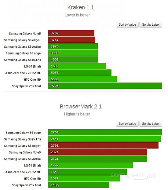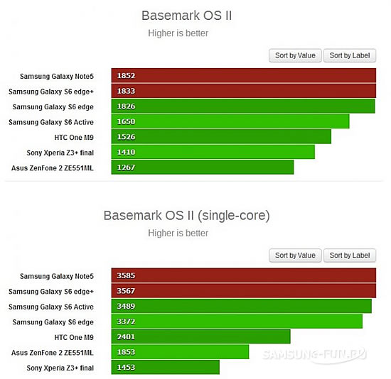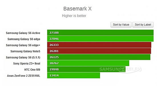 У бенчмарці GeekBench 3 смартфони Galaxy Note5 і Galaxy S6 edge + показали практично однаковий результат з іншими нинішніми флагманами корейського виробника. В той час як в AnTuTu 5 обидві новинки набрали майже по 70 000 балів. Basemark OS II, GFXBench і Basemark X апарати також показали себе як справжні флагмани.