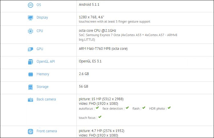Судячи з попередньою інформацією, розкритої в бенчмарку GFXBench, новинка отримає 8-ядерний процесор Exynos 7420 (чотири ядра Cortex-A57 з тактовою частотою 2,1 ГГц і чотири ядра Cortex-A53 з частотою 1,5 ГГц) і 3 Гб оперативної пам’яті. Місткість флеш-модуля складе 64 Гб. Роздільна здатність і діагональ екрану – 1280 х 768 та 4,6 дюйма. Щоправда, не ясно, про який дисплей йде мова – зовнішньому, внутрішньому або обох. Згадано камери з 16 і 5 Мп матрицями, підтримка LTE, адаптери Wi-Fi і Bluetooth, приймач GPS, модуль NFC, акселерометр, гіроскоп, барометр, електронний компас, датчики наближення і освітленості. Операційна система – Android 5.1.1 Lollipop.