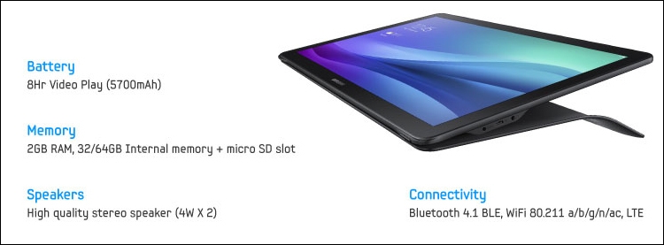 У новинці використовується операційна система Android 5.1 Lollipop. При цьому, як стверджує Samsung, інтерфейс спеціально оптимізований для роботи з відеоматеріалами та іншим мультимедійним контентом. Практично всі раніше озвучені технічні характеристики комп’ютера підтвердилися. Він отримав 8-ядерний процесор з тактовою частотою 1,6 ГГц і 2 Гб оперативної пам’яті. Ємність накопичувача може становити 32 або ж 64 Гб; плюс до цього є слот для карти microSD.