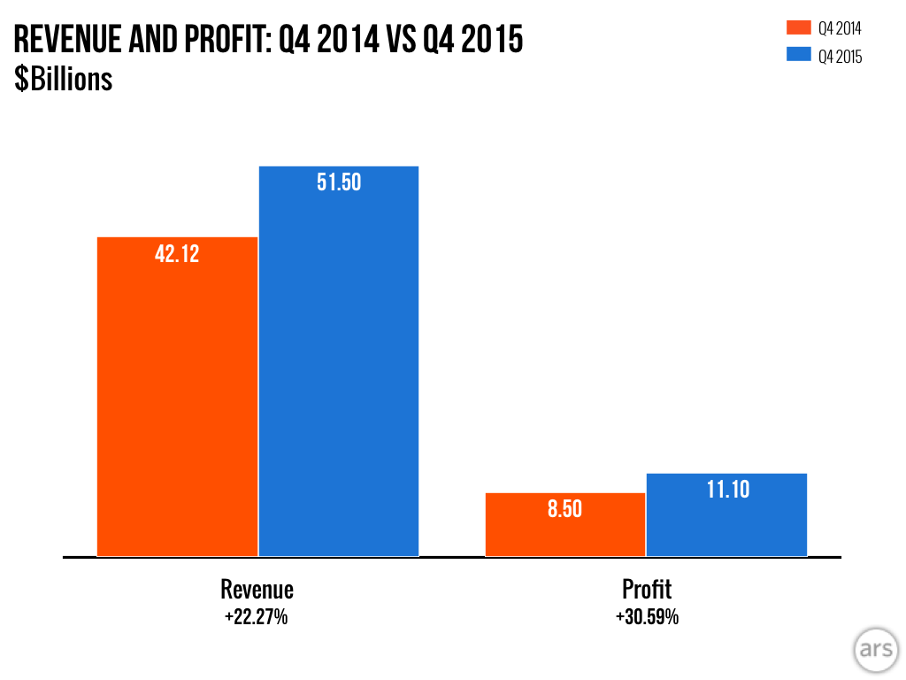 У наступному кварталі Apple очікує виручити від $ 75,5 млрд до $ 77,5 млрд. Норма прибутку повинна утриматися в діапазоні від 39% до 40%. За весь 2015 фінансовий рік Apple вдалося продати 231 млн iPhone, 55 млн iPad і 21 млн комп’ютерів Mac. Частки ринку, які займають iPhone та Mac, досягли рекордних значень.